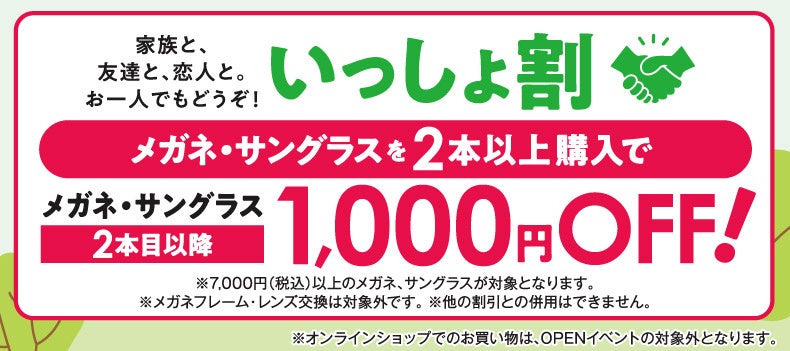 期間中、メガネ・サングラスを2本以上一緒にご購入いただくと、購入本数に応じた特典が受けられます。