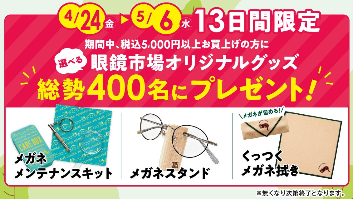 期間中、5,000円(税込)以上ご購入いただくと、お好きな眼鏡市場オリジナルグッズをお選びいただけます。