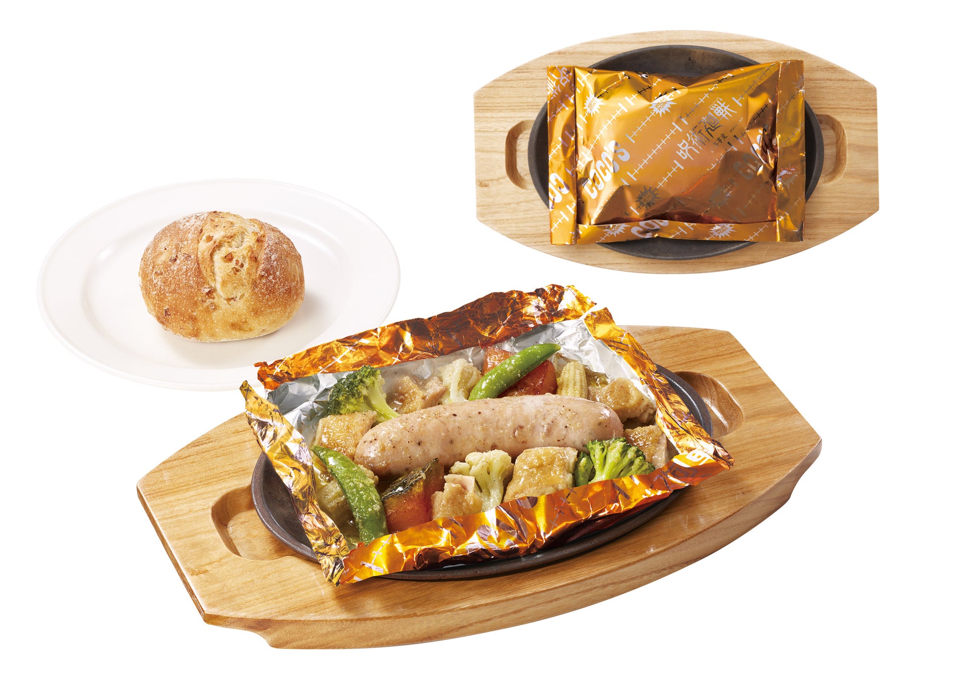 七海(ななみ)の好物のアヒージョを包み焼きにした、ワインのおつまみにぴったりな一品です。七海(ななみ)のキャラクターカラーと術式(じゅつしき)「十劃呪法(とおかくじゅほう)」をイメージし、コラボメニュー限定デザインのアルミホイルで包みました。ジューシーで肉厚な国産ソーセージは、「十劃呪法(とおかくじゅほう)」にちなんで7:3に切り分けてお召し上がりください。付けあわせの石窯パンとアヒージョソースの相性は抜群です。