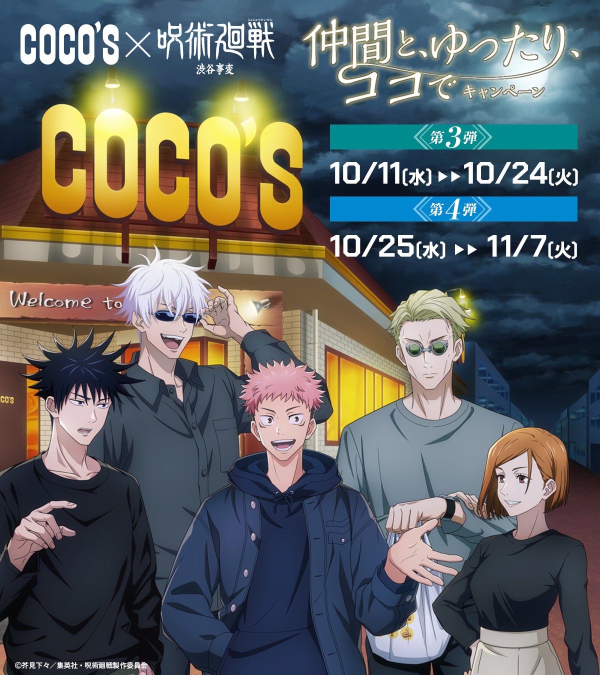 7月5日(水)~8月1日(火)に実施した「ココス×呪術廻戦 懐玉(かいぎょく)・玉折(ぎょくせつ) 仲間と、ずっと、ココでキャンペーン」に続き、10月11日(水)~11月7日(火)に「ココス×呪術廻戦 渋谷事変 仲間と、ゆったり、ココでキャンペーン」を開催します。