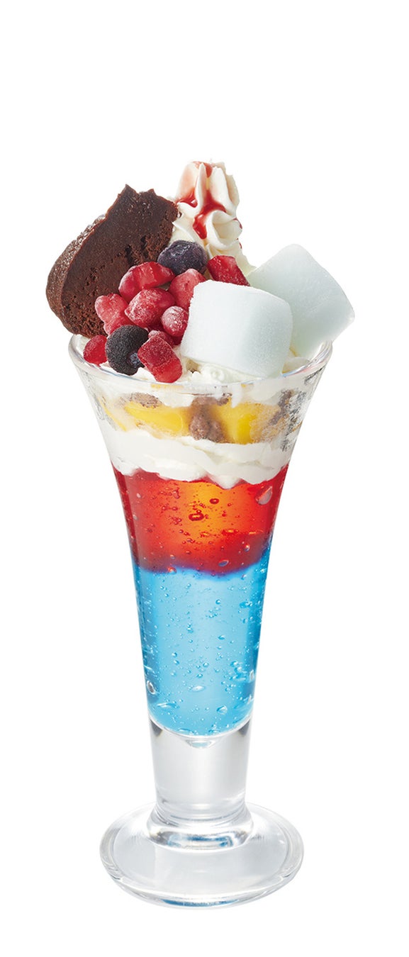 五条(ごじょう)の術式(じゅつしき)「無下限呪術(むかげんじゅじゅつ)」をイメージしたカラフルなパフェです。術式順転(じゅんてん)の「蒼(あお)」、術式反転(はんてん)の「赫(あか)」をゼリーで表現しました。トップには五条(ごじょう)を封印した「獄門疆(ごくもんきょう)」をイメージしたキューブ状のソーダ葛(くず)アイスを2個トッピングしました。味だけでなく見た目もお楽しみいただける一品です。