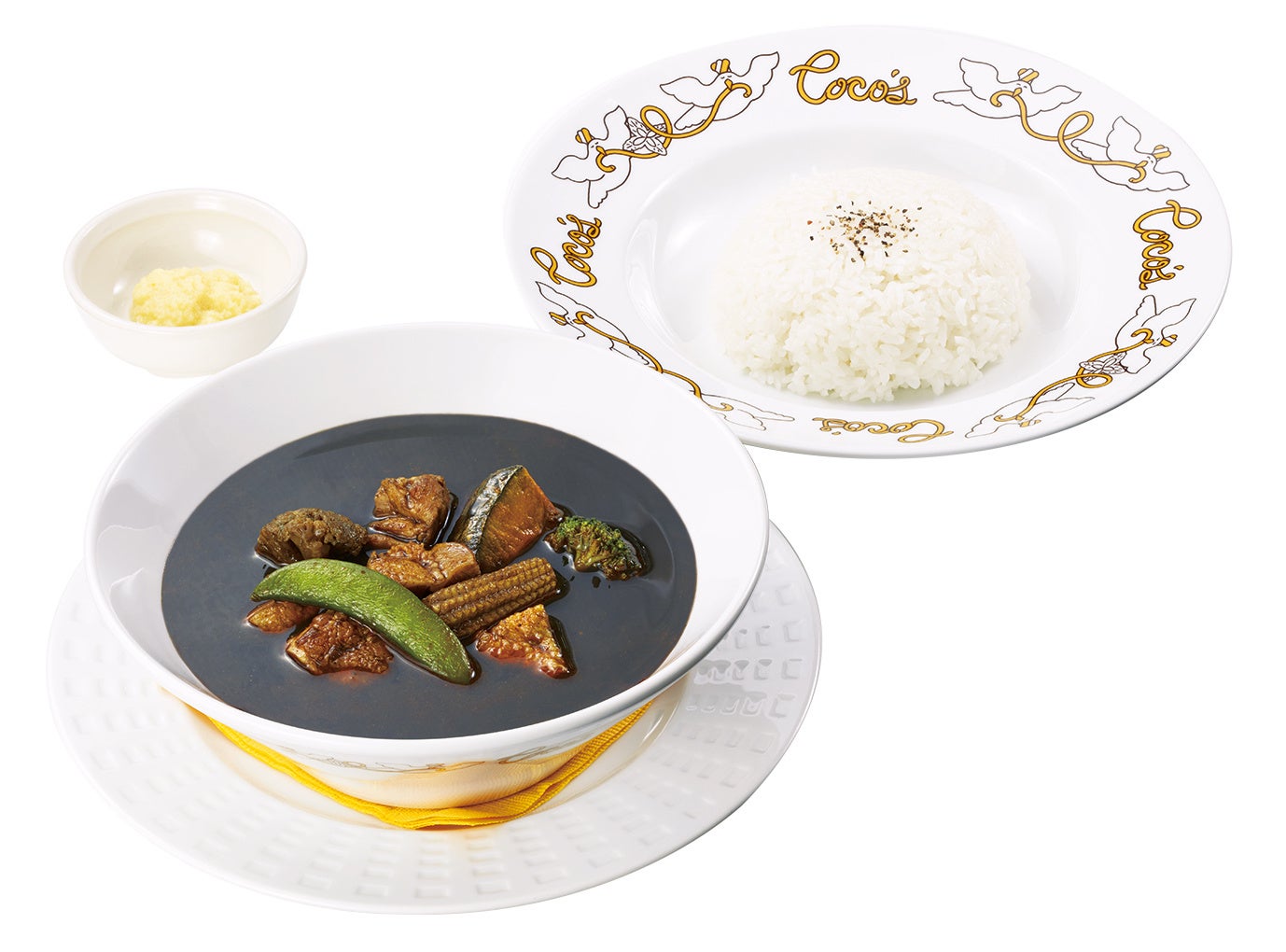 伏黒(ふしぐろ)の術式(じゅつしき)「十種影法術(とくさのかげぼうじゅつ)」をイメージした、イカスミがベースの黒いスープカレーです。伏黒(ふしぐろ)の好物である生姜をペースト状にして添え、ひと味違った味わいを楽しめる商品に仕上げました。黒いスープカレーで影を、チキンやブロッコリー、ヤングコーンなどたっぷりの具材で式神を表現したボリュームたっぷりの一品です。「十種影法術(とくさのかげぼうじゅつ)」の影絵のように変化する奥深い味わいをお楽しみください。別添えのペースト状の生姜で味変をするのもおすすめです。