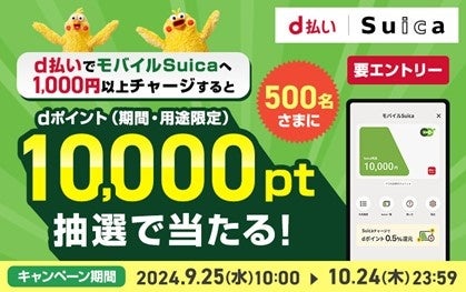 株式会社NTTドコモ(以下、ドコモ)は、「d払い®でモバイルSuicaチャージするとdポイントが抽選で10,000pt当たる!キャンペーン」(以下、本キャンペーン)を2024年9月25日(水)から2024年10月24日(木)までの期間で開催いたします。
