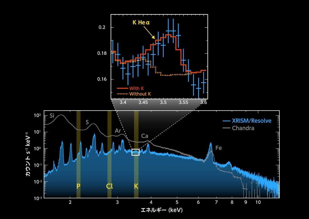 ・XRISMの優れた分光能力により、超新星爆発の残骸「カシオペア座A」の起源となった巨大な星の内部で、大量の塩素・カリウムが合成されていた証拠を得た。