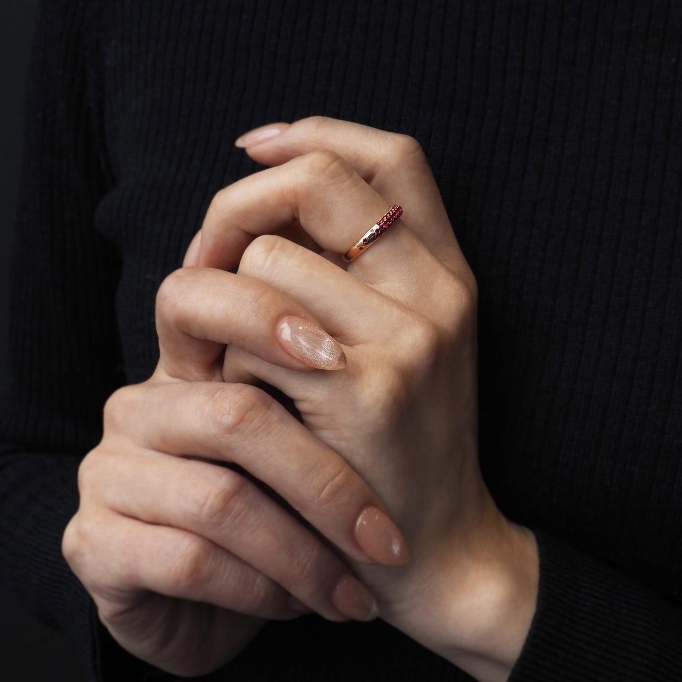細身のアームに5ピースの宝石を端正に配したLuce。すっきりとした佇まいのなかに、それぞれの色が軽やかなリズムを奏でるリングです。