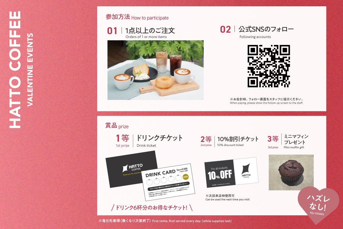バレンタイン記念イベントとして、限定スイーツの販売とハズレなしのくじ引きを実施します。今年のバレンタインは、原宿の喧騒から離れた穴場カフェ「HATTO COFFEE」で、大切な方とのひと時をごゆっくりお楽しみください。