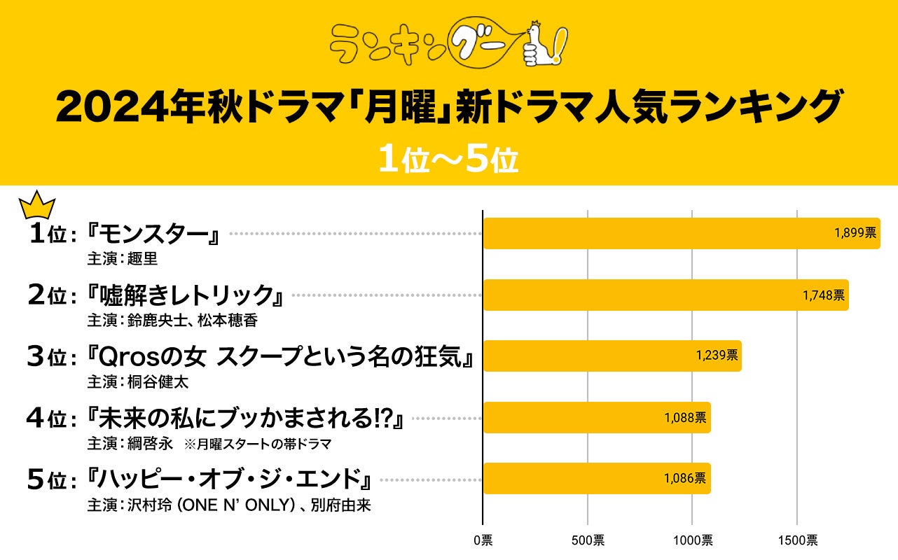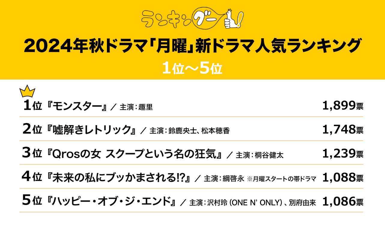 ◆2024年秋ドラマ「月曜」新ドラマ人気ランキング TOP5抜粋