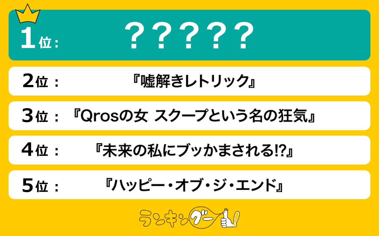 2位は人気コミック原作のレトロ・ミステリー『嘘解きレトリック』。3位には、芸能界の闇やSNS社会の恐ろしさを描いた『Qrosの女 スクープという名の狂気』。4位には予測不能のタイムトラベルドラマ『未来の私にブッかまされる⁉』。そして、2票差で5位にランクインしたのは、大ヒットBL漫画が原作の『ハッピー・オブ・ジ・エンド』でした。