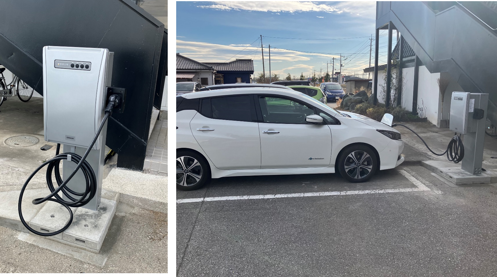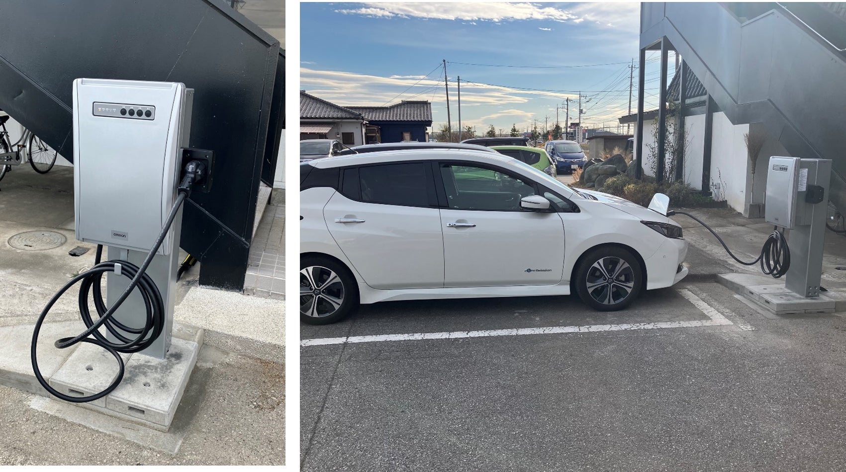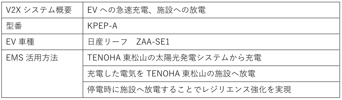今回新たに、オムロン製のV2X※2 システム「マルチV2Xシステム(KPEP-A)」とEV※3(東京センチュリー連結子会社の日本カーソリューションズ株式会社がリース提供するニッサン リーフ)を本施設に設置いたしました。これらと太陽光発電を連動して充放電を行い、ピークカットによる電気料金の削減効果等を検証するとともに、停電時等においてEVからエネルギーを供給するなどの効率的なEMS構築を目指します。