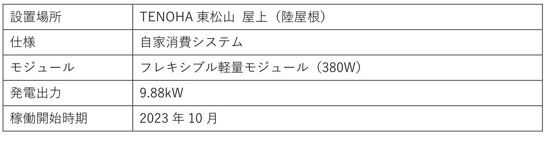 TENOHA東松山は、東急不動産が手掛ける、再生可能エネルギーを活用した地域共生プロジェクトの拠点施設です。2023年10月より建物屋根上にフレキシブル太陽光モジュール※1 を設置して電力の自家消費を行っており、使用電力の約30%を再生可能エネルギーで賄っています。