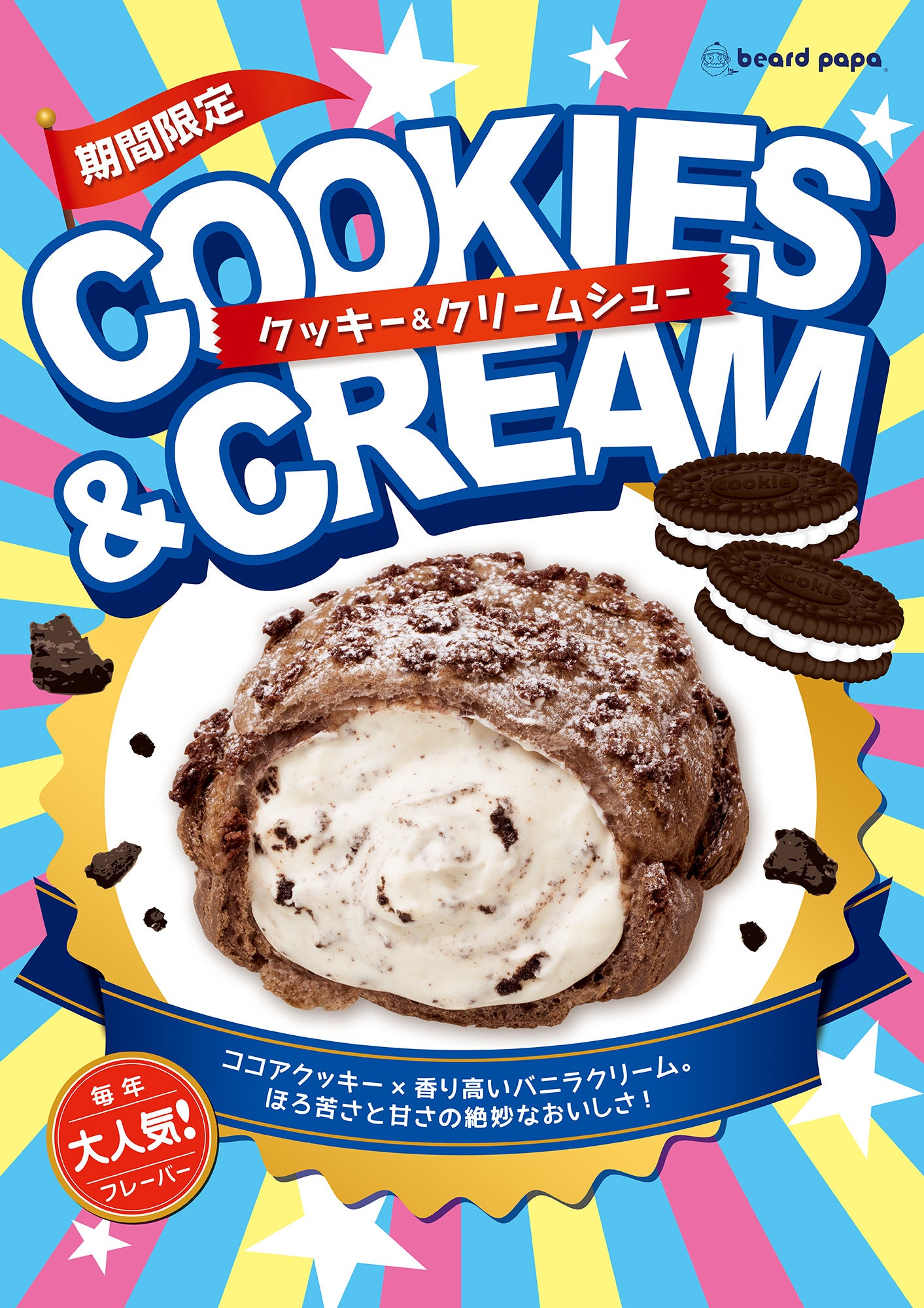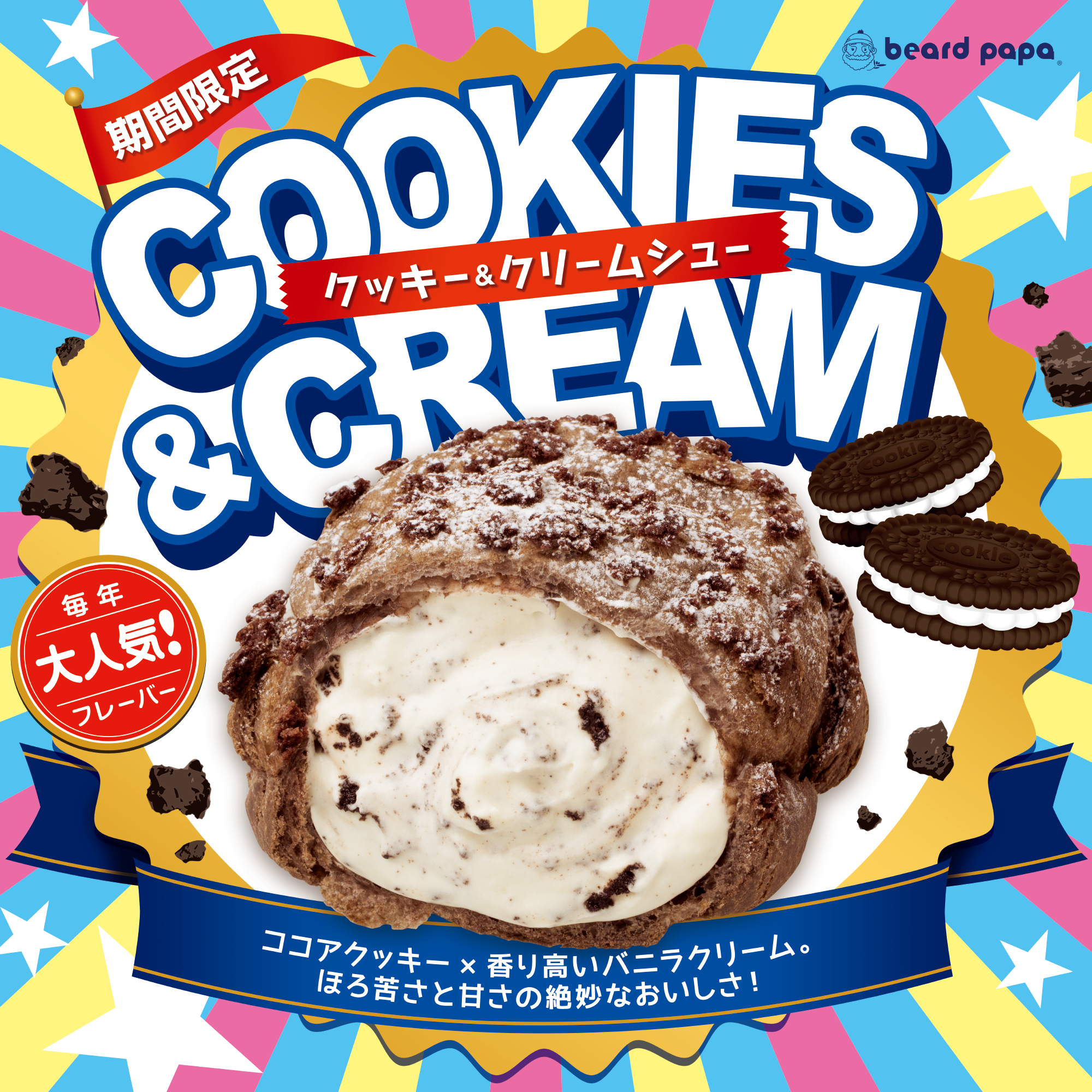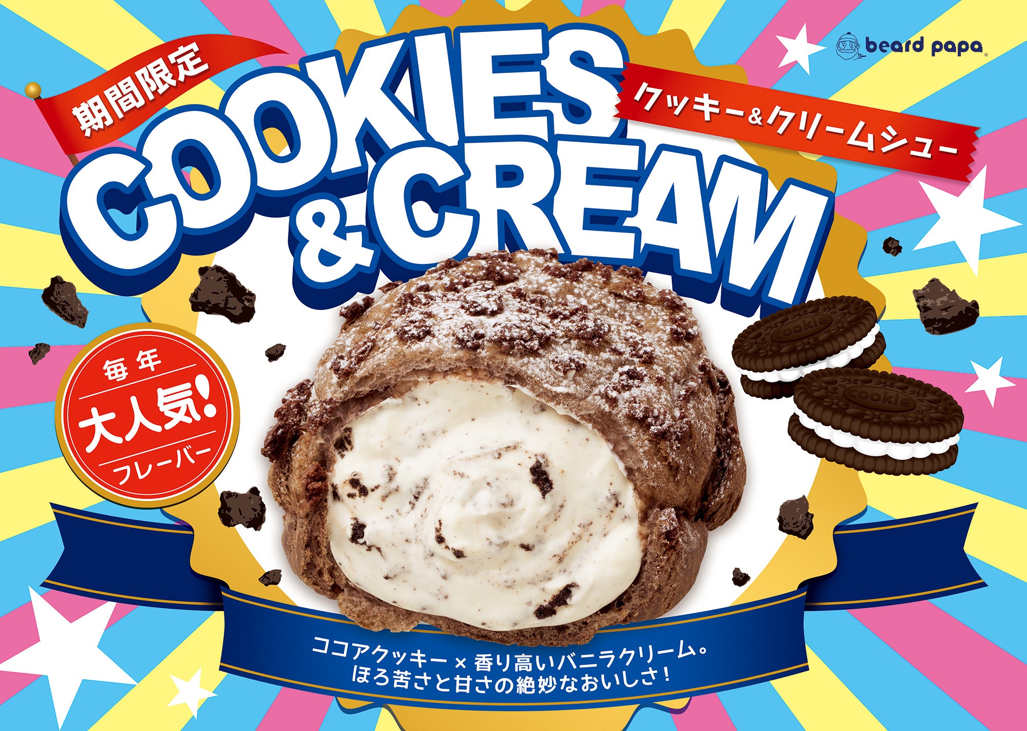 また、毎年大人気のフレーバー“クッキー&クリームシュー”も同時発売。アイスクリームで定番の味わいである「ココアクッキー×香り高いバニラクリーム」の絶妙なおいしさを、シュークリームでご堪能いただけます。