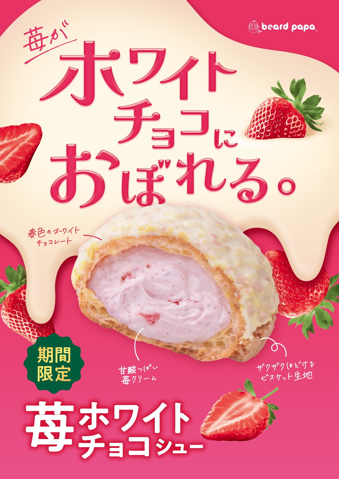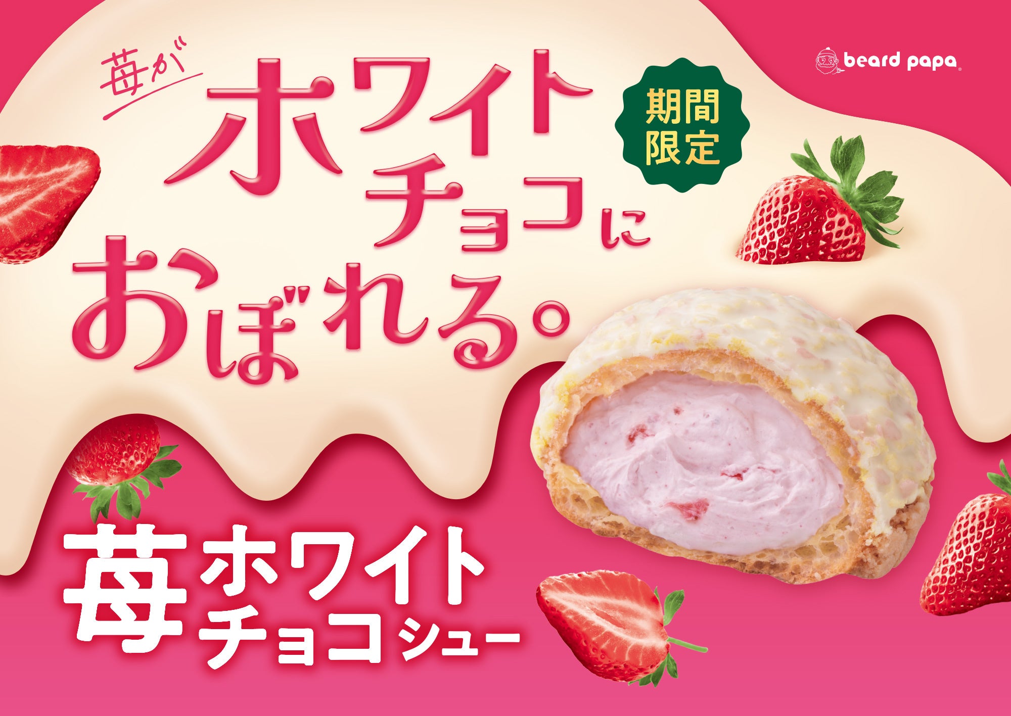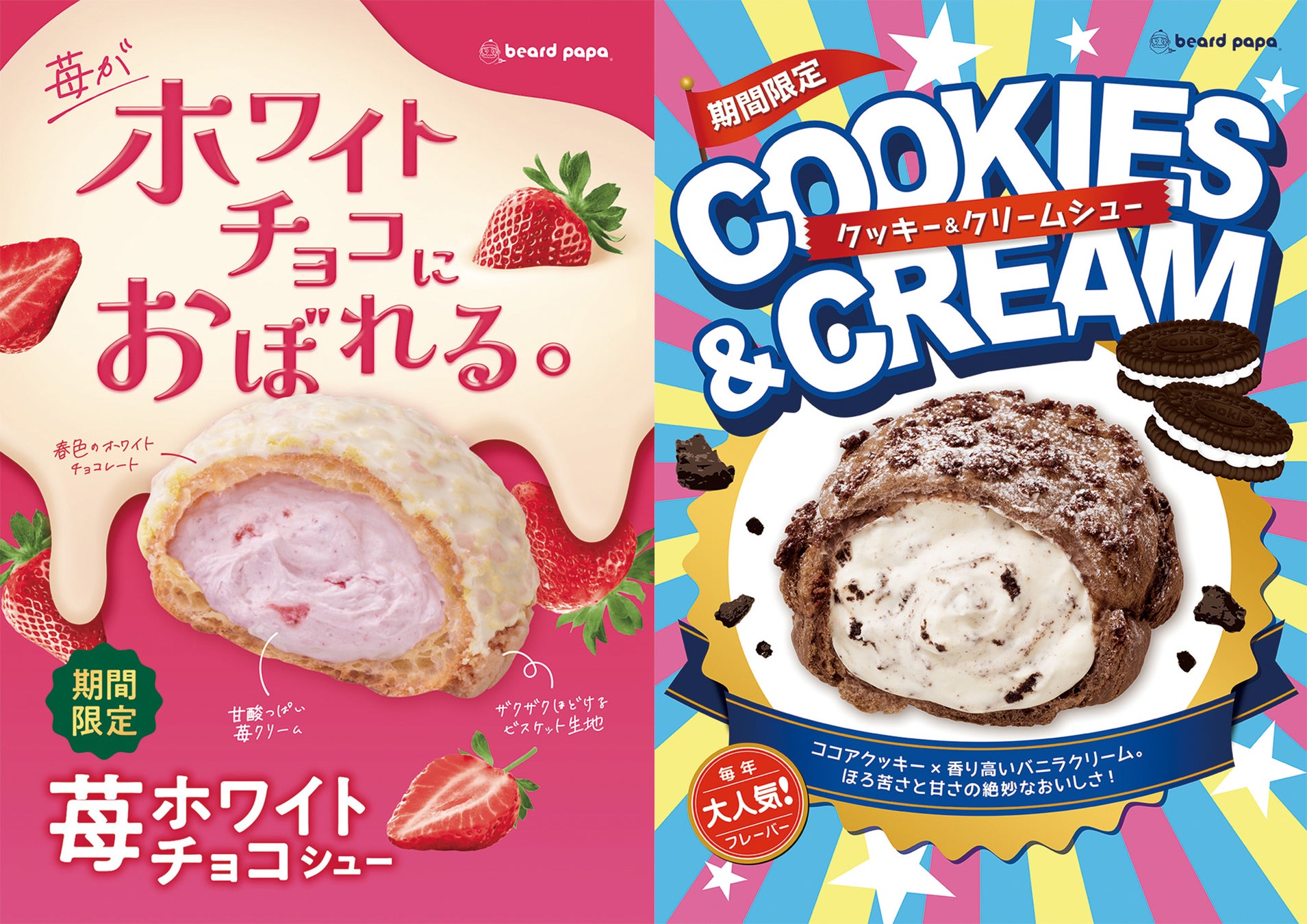 ビアードパパより、「ホワイトチョコ×苺」にときめく春の新作“苺ホワイトチョコシュー”と、「ココアクッキー×バニラ」で人気の “クッキー&クリームシュー”が同時発売!