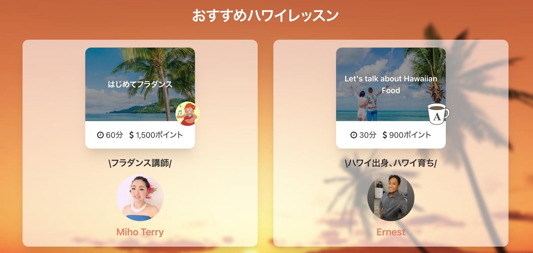 ハワイ出身講師と英語で学ぶハワイの文化、日本人講師による、全くの初級〜キッズも大歓迎のフラダンスレッスンなど、ハワイの風を感じるオンラインレッスンが揃っています。