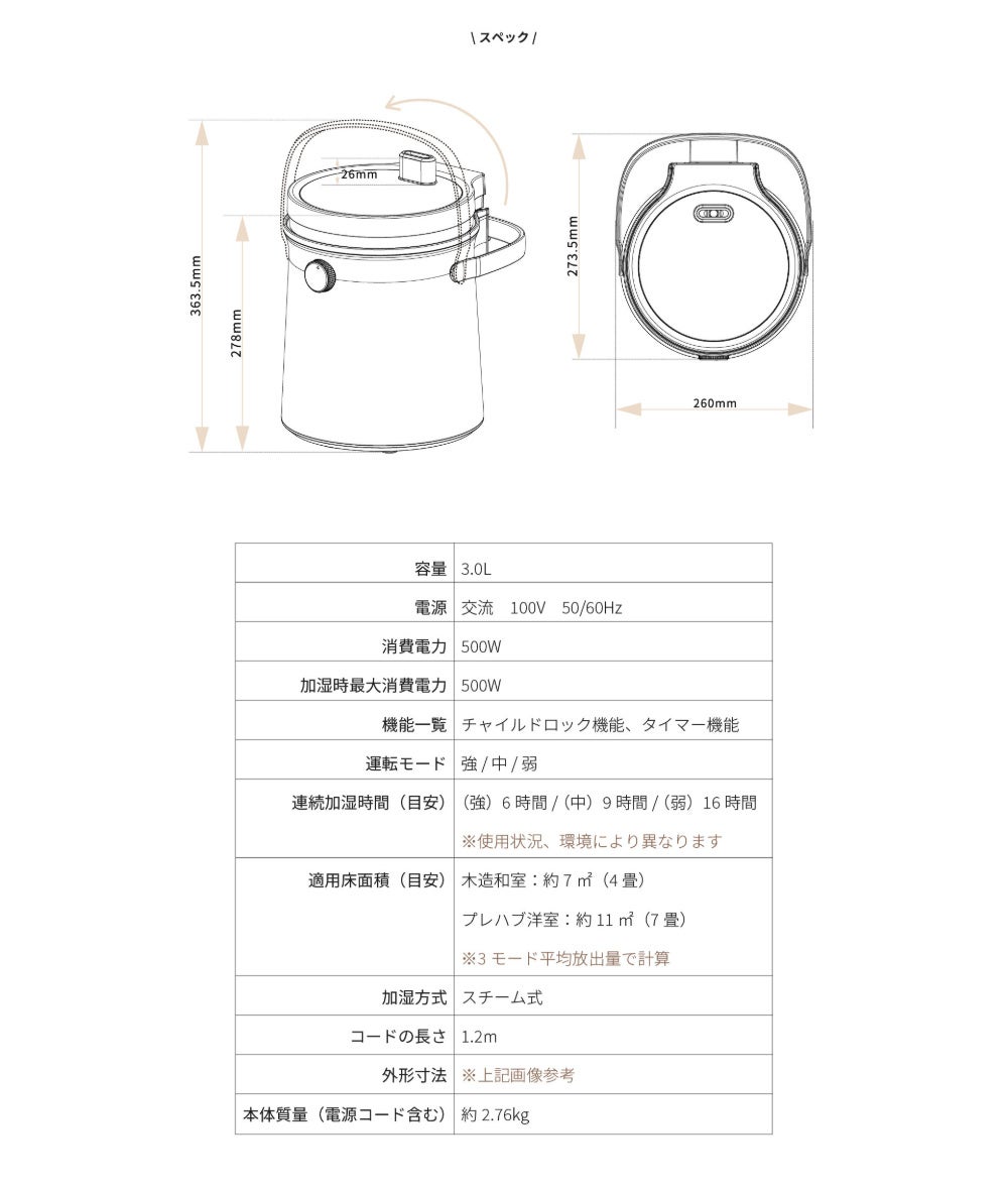 しかも、スチーム式は沸騰させたお湯の蒸気で潤すため、雑菌が繁殖しにくくメンテナンスは簡単。フィルターレスだから長期保管前のお手入れもあっという間に完了します。