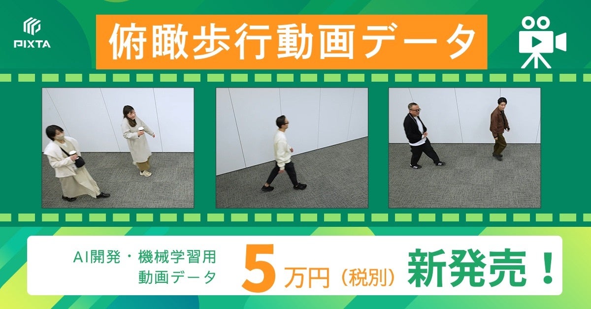 ピクスタ株式会社(東京都渋谷区 代表取締役社長:古俣大介、東証グロース:3416)が運営する写真・イラスト・動画・音楽素材のマーケットプレイス「PIXTA(ピクスタ)」は、「機械学習用画像・動画データ提供サービス」として、新たに撮り下ろした機械学習用「俯瞰歩行動画データ」の販売を開始いたします。