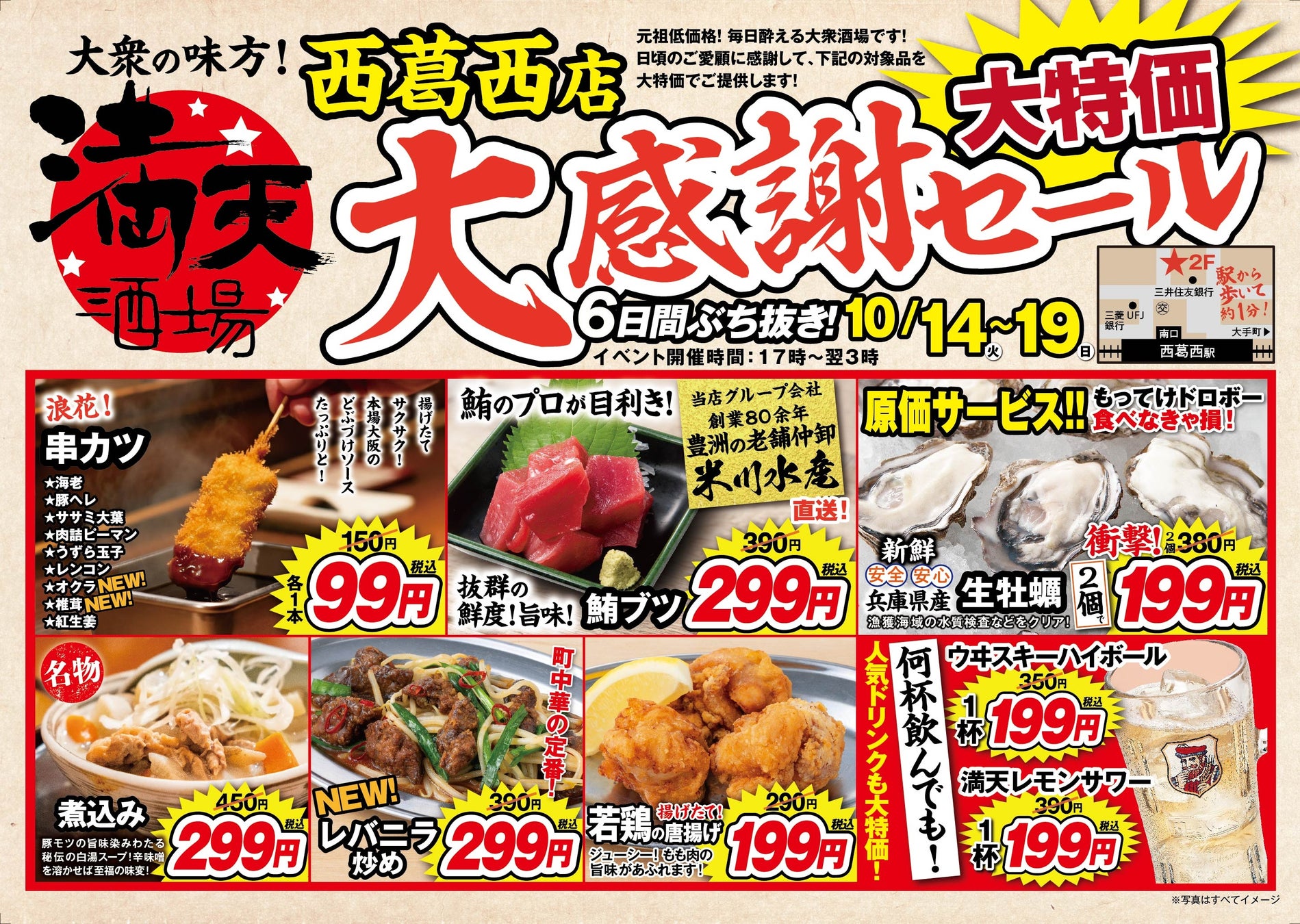 “大衆の味方”を掲げる元祖低価格『満天酒場』西葛西店(運営:株式会社大庄)は、2025年10月14日(火)から10月19日(日)までの6日間限定で、日頃のご愛顧に感謝を込めて「大特価!大感謝セール」を開催します。期間中17時〜翌3時の間、海老・豚ヒレ・肉詰めピーマンなどの「串カツ」(全9種)を通常1串150円のところ99円、国産「生カキ」通常2個380円を2個199円で提供。いずれも1つ100円以下というほぼ原価の破格値です。さらに、名物の「もつ煮込み」は通常450円が299円、豊洲市場直送の「鮪ブツ」は通常390円が299円、「若鶏の唐揚」は通常290円が199円、「レバニラ炒め」は通常390円が299円と、人気のつまみ4種も衝撃の超特価です!