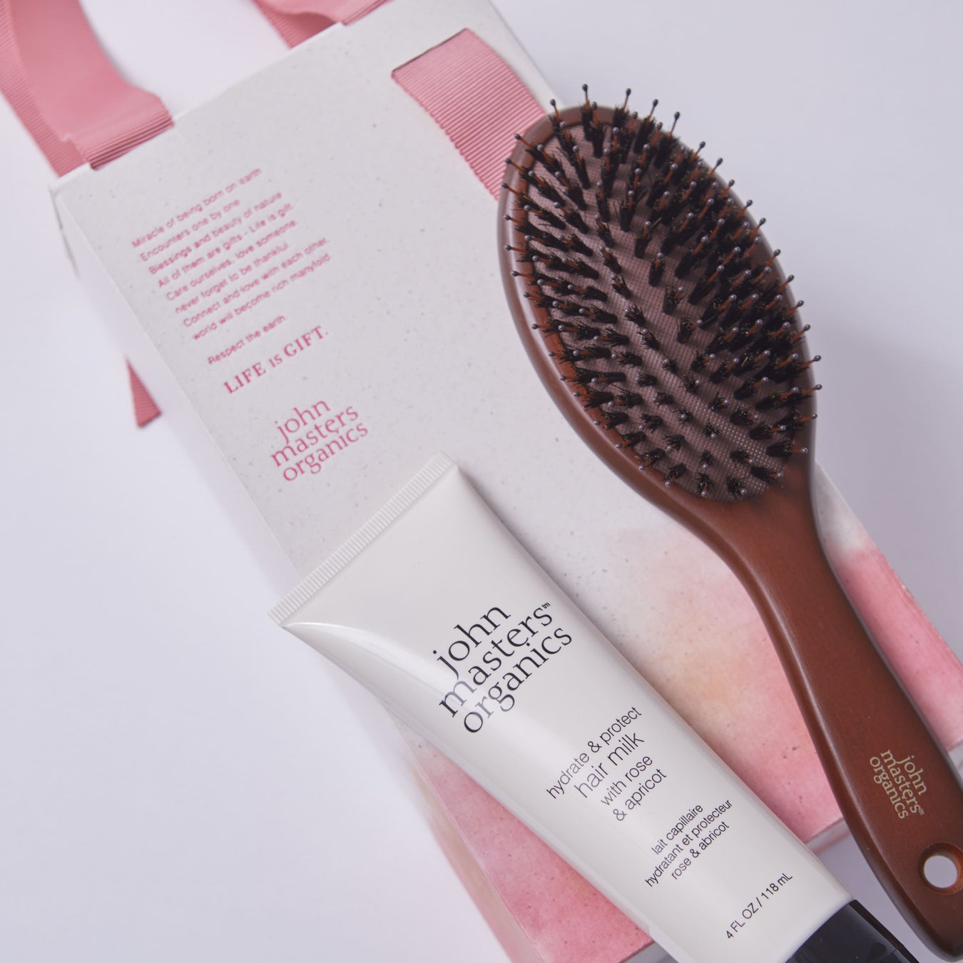 刻印ギフトで人気のコンボパドルブラシとフレッシュなダマスクローズが⾹るヘアミルクのセット。名前や星座を刻印したパーソナルなギフトにも。