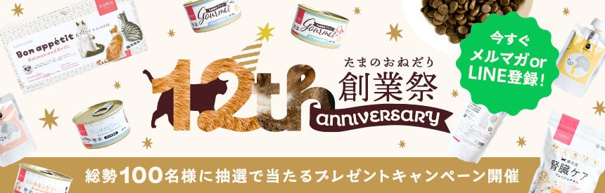プレミアムキャットフードメーカー「tama」(運営:マーケティングパートナー株式会社、本社所在地:東京都新宿区、代表取締役社長:泰地正人、Tel:03-6772-8194、https://www.tamaone.jp/)は、創業12周念を記念して、3月31日(火)より「12周年創業祭」を開始。4つの豪華プレゼントが、抽選で総勢100名様に当たります。メルマガもしくはLINEのお友達登録だけで、応募が可能です。