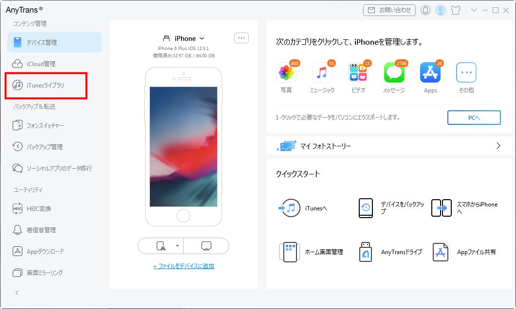step2.AnyTransのメイン画面で、「iTunesライブラリ」をクリックしてください。