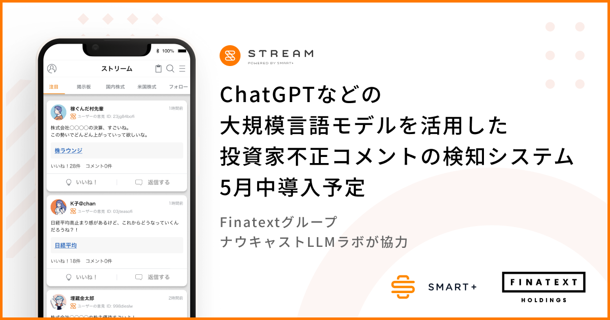 誰でも従来型売買手数料0円株取引型アプリ「STREAM」、ChatGPTなどを含む大規模言語モデルを活用した投資家不正コメントの検知システムを5月中導入予定
