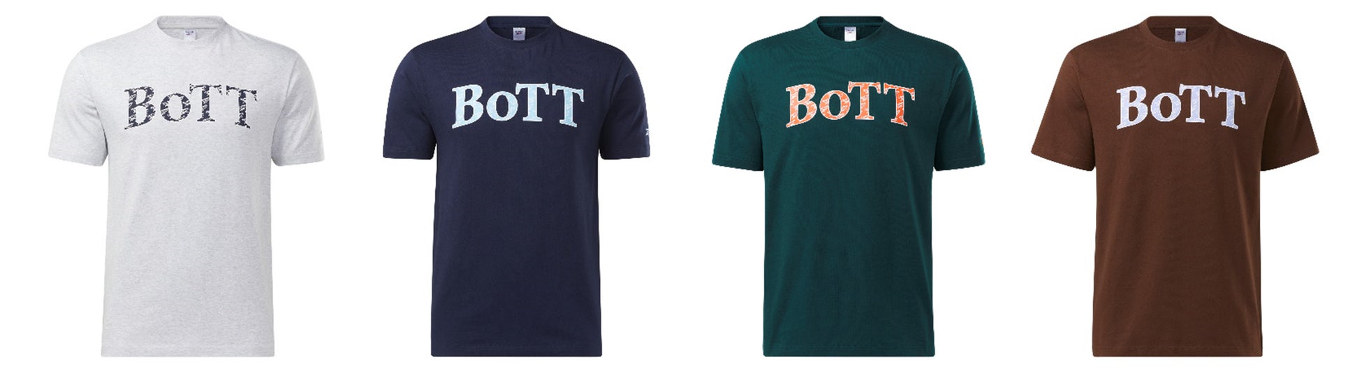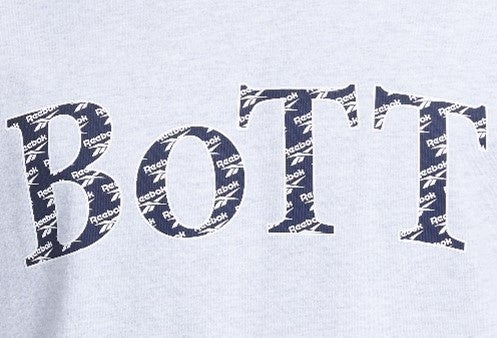 この季節に大活躍のショートスリーブTシャツも登場。「BoTT」の代表的なロゴウェアをリーボックとのコラボロゴでアレンジしたデザインを施しています。「BoTT」の文字が大胆にあしらわれた“OG Logo”と呼ばれるブランドのシグネチャーロゴデザインをベースに、リーボックベクターロゴのリピートパターングラフィックを各フォントの中に配置したユニークなブランドロゴマッシュアップを採用しています(右図)。また、「BoTT」の文字が施された、襟首のプリントもポイントのひとつです。グレー、ブラウン、ダークグリーン、ブルーの全4色展開のため、ご自身のスタイリングに合わせてお好みの1着をお選びいただけます。