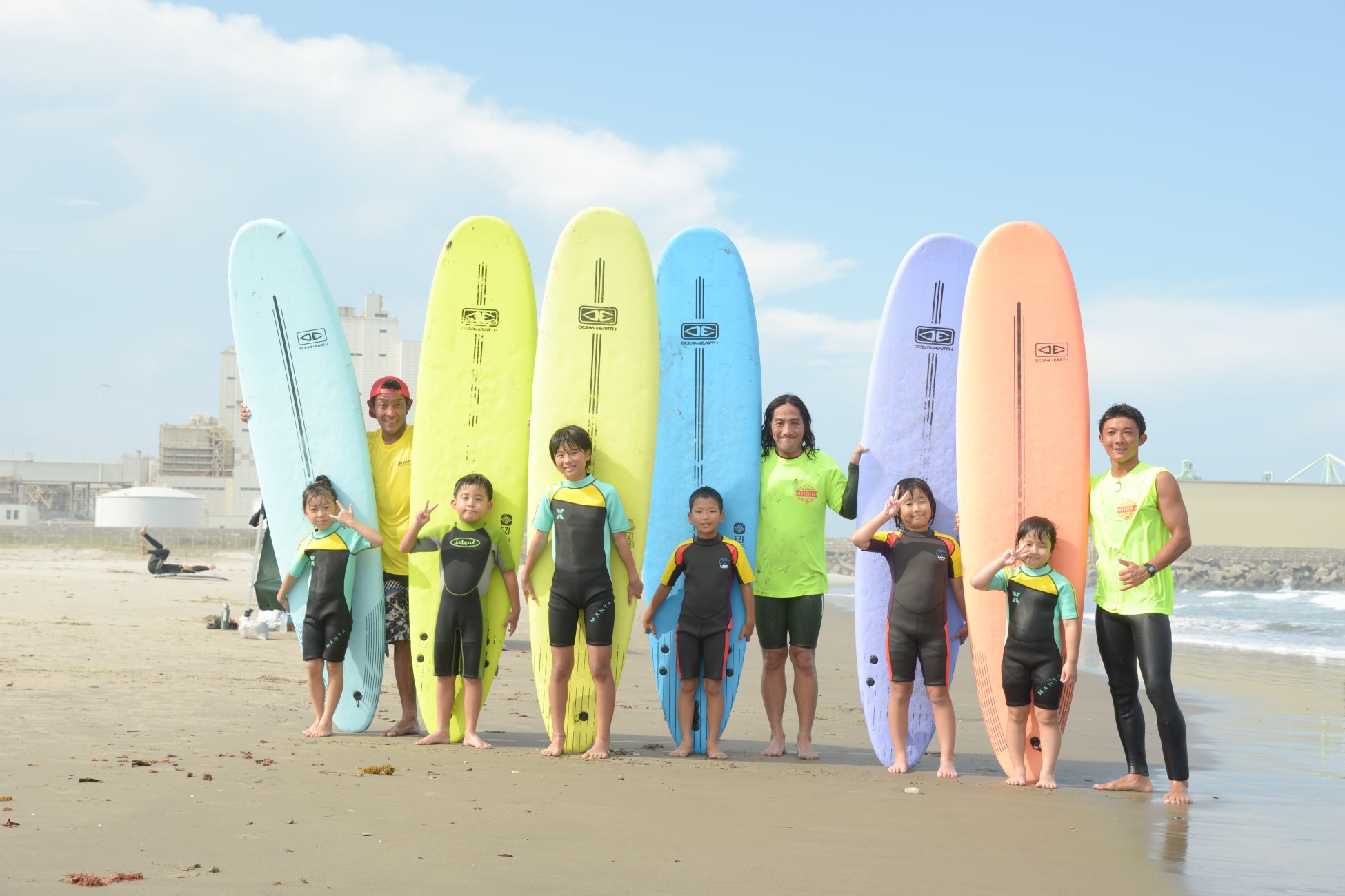 毎年好評の初心者向け体験会。地元のローカルサーファーやライフセーバーがインストラクターを務め、小・中学生の参加者に安全で楽しいサーフィンを提供します。