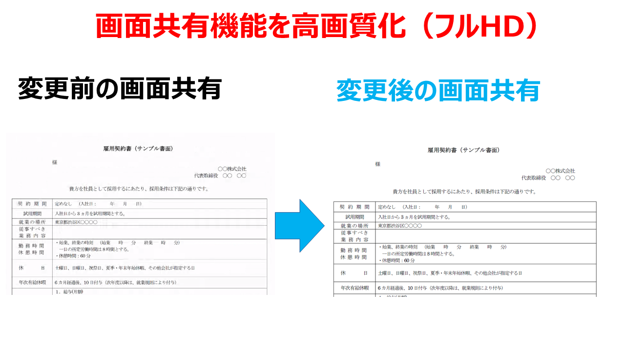 SOKUMENでの面談中に雇用契約書や資料の説明をする際に応募者の方から字が小さい場合に見えずらいという声が挙がっていると派遣会社様からお聞きすることがございましたので画面共有時の映像をフルHDに仕様変更いたしました。今回の変更で細かな文字も見やすくなりました。派遣応募者へお仕事説明、雇用手続きなどで資料やWebページを使って説明する際にもスムーズに行えるようになります。