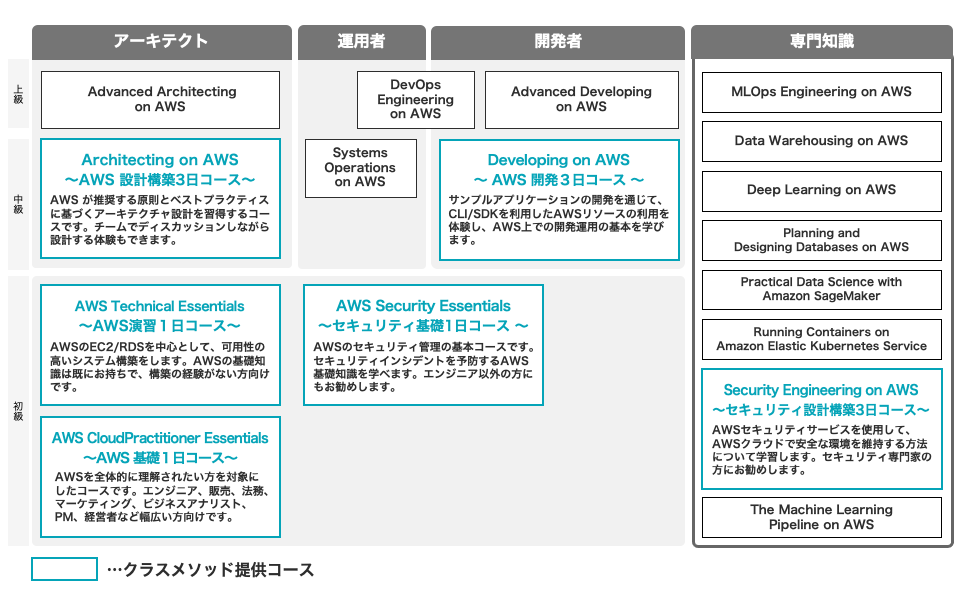 クラスメソッドは2019年にAWSパートナーネットワークトレーニングパートナー認定を取得し、3年間にわたってAWS基礎や構築演習、セキュリティなどのコースを提供してきました。このたびのコース追加により、クラスメソッドから提供するAWS公式トレーニングは全6種となります。