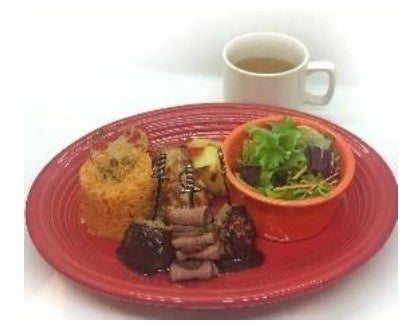 デミソースのミートボール、ローストビーフ、チキンウイングをメインにミニサラダ、ケチャップライスにスープを付けたランチプレート。※16:00までのご提供