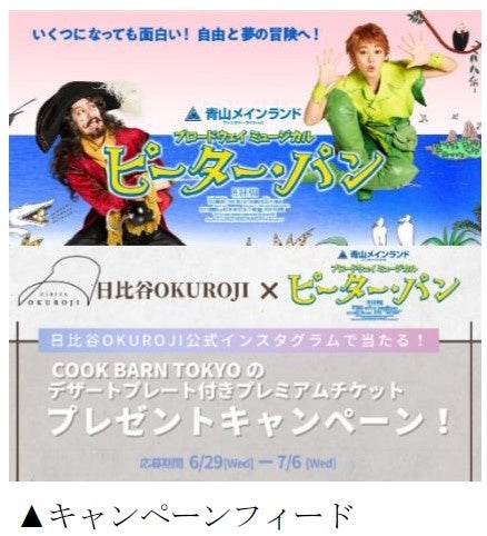 内 容:日比谷OKUROJIの飲食店舗「COOK BARN TOKYO」では、ブロードウェイミュージカル「ピーター・パン」とのタイアップを記念し、物語に登場する妖精ティンカーベルのデザートプレートがついたS席チケットを販売。