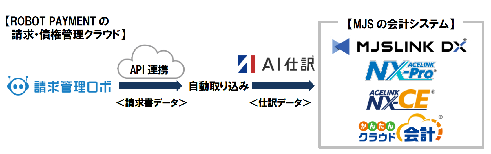 財務・会計システムおよび経営情報サービスを開発・販売する株式会社ミロク情報サービス(本社:東京都新宿区、代表取締役社長:是枝 周樹、以下「MJS」)は、企業のお金をテクノロジーでつなぐサービスを提供する株式会社ROBOT PAYMENT(本社:東京都渋谷区、代表取締役:清久 健也、以下「ROBOT PAYMENT」)の請求・債権管理クラウド『請求管理ロボ』と、MJSの会計システム4製品、『MJSLINK DX(エムジェイエスリンク ディーエックス)財務大将』『ACELINK NX-Pro(エースリンク エヌエックスプロ)会計大将』『ACELINK NX-CE(エースリンク エヌエックス シーイー)会計』『かんたんクラウド会計』のオプション機能「AI仕訳」とのAPI連携を開始しました。