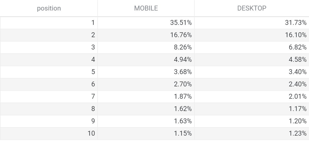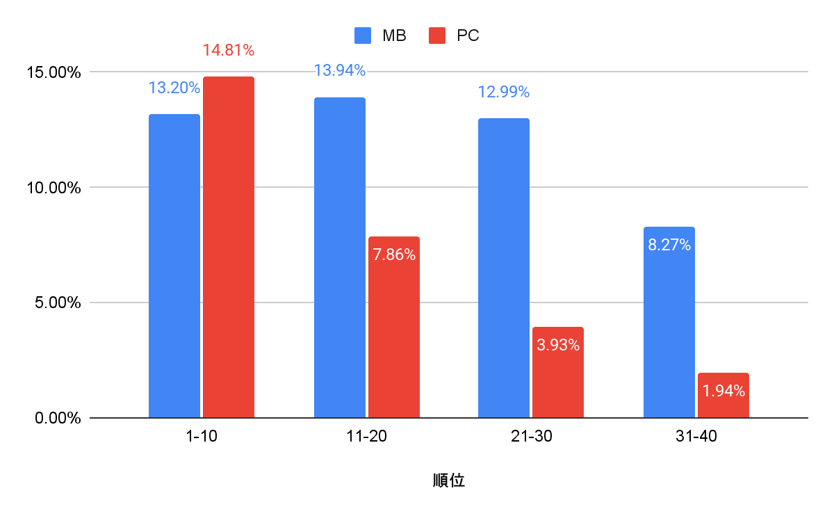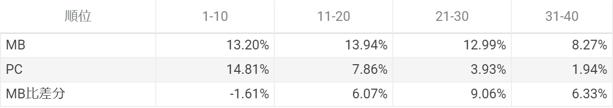 詳細数値は以下の通りです。1〜10位ではPCサイトの数値が高く、11位以下だとモバイルサイトの数値が高いです。