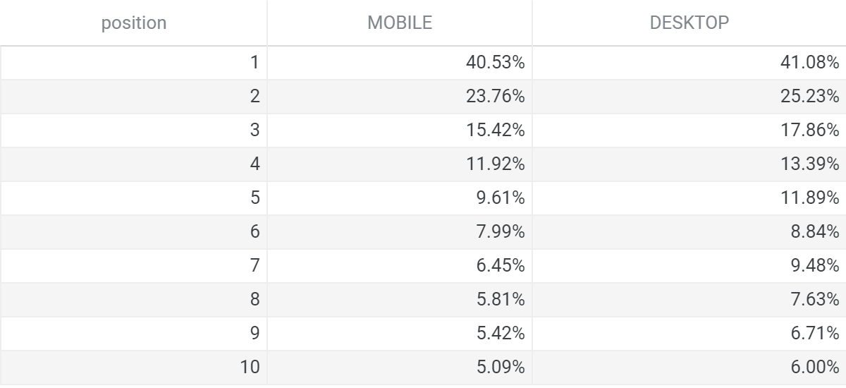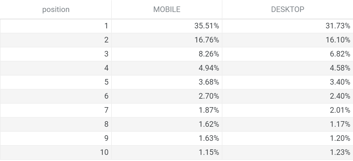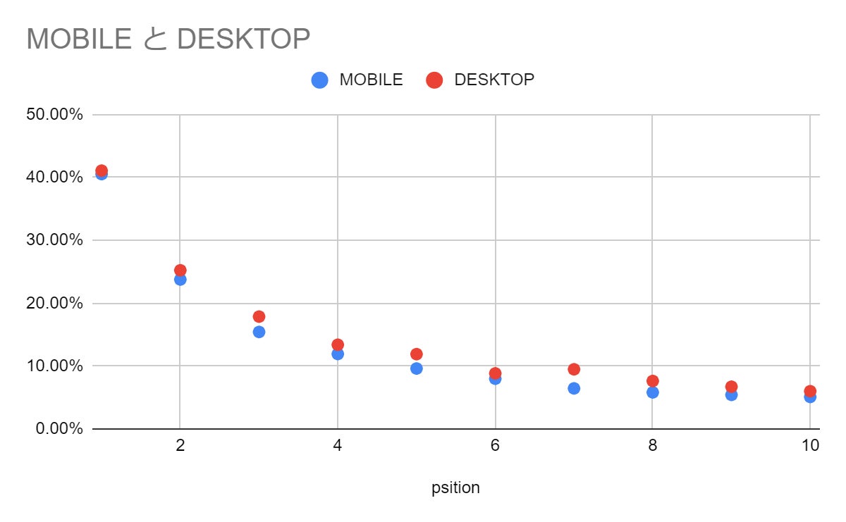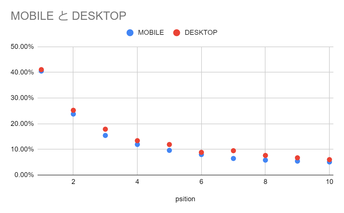 以下は、上記までの数値のうち1位から10位のみに絞ったものです。モバイルサイトの1位CTRは40.53%、PC際サイトの1位CTRは41.08%でした。1位から10位までのCTRについてはPC/モバイルで大きな差にはなっていませんが、どの順位でもわずかにPCサイトが高い結果になっています。