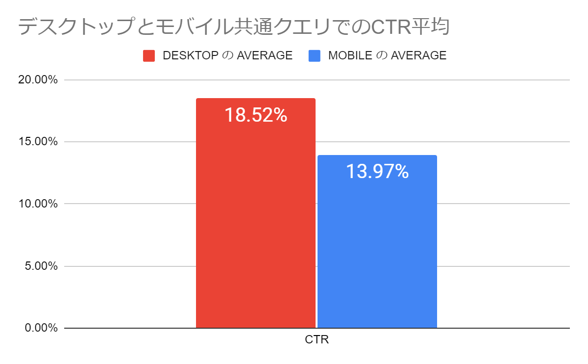 なぜ11以下でこのような差が出てくるのかについて追加で調査を行いました。1つ目の追加調査は、観測順位が11~20位にあり、かつデスクトップとモバイルで共通してCTRが計測されているクエリについてのみ平均値を比較したものです。結果としてはモバイルの方がCTR平均はデスクトップに比較して低い結果でした。しかし、CTR平均値自体はいずれも13%を超えているという結果でした。