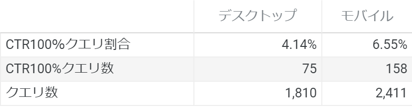 2つ目の追加調査は、11~20位内で該当するクエリにおいてCTRが100%、つまり1インプレッションに対して1クリック発生した、などの実数への影響は少ないが割合の集計には影響を及ぼすケースのクエリがどの程度含まれるかについてデスクトップとモバイルで比較したものです。結果として、モバイル版の方がCTR100%クエリの全体クエリに対する割合が高いという結果でした。この一連の結果からは、そもそもモバイルのみに観測されるクエリ数が多いこと、そしてCTR100%といった平均値に影響するようなロングテールクエリの割合もモバイルの方が高くなっていることが、11以下でのCTRにおけるデスクトップとモバイルでの差がでる要因の1つと考えられます。