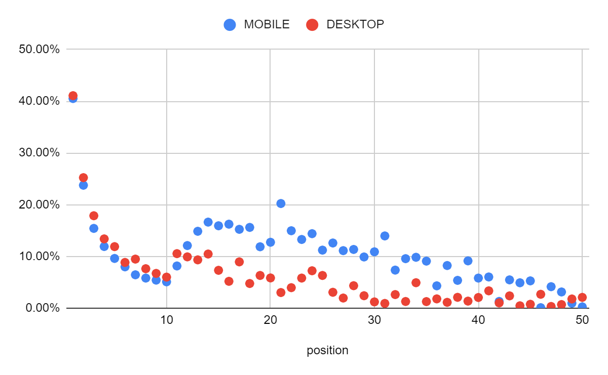 以下は、上記までの数値を1位から50位まで個別にプロットしたものです。1位から10位までの数値はPC/モバイルともに同様の傾向を見せていますが、11位以下の傾向に差が出ているのがわかります。また、モバイルサイトにおいて21位の数値および31位の数値はそれぞれの前後数値に比べて突出しているように見えます。これらは検索結果画面において10件単位で表示されるため、それぞれがページの最上部に表示される事が関係していると推測できます。