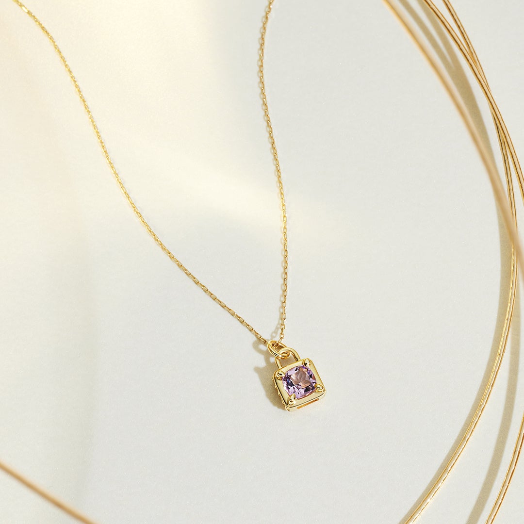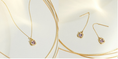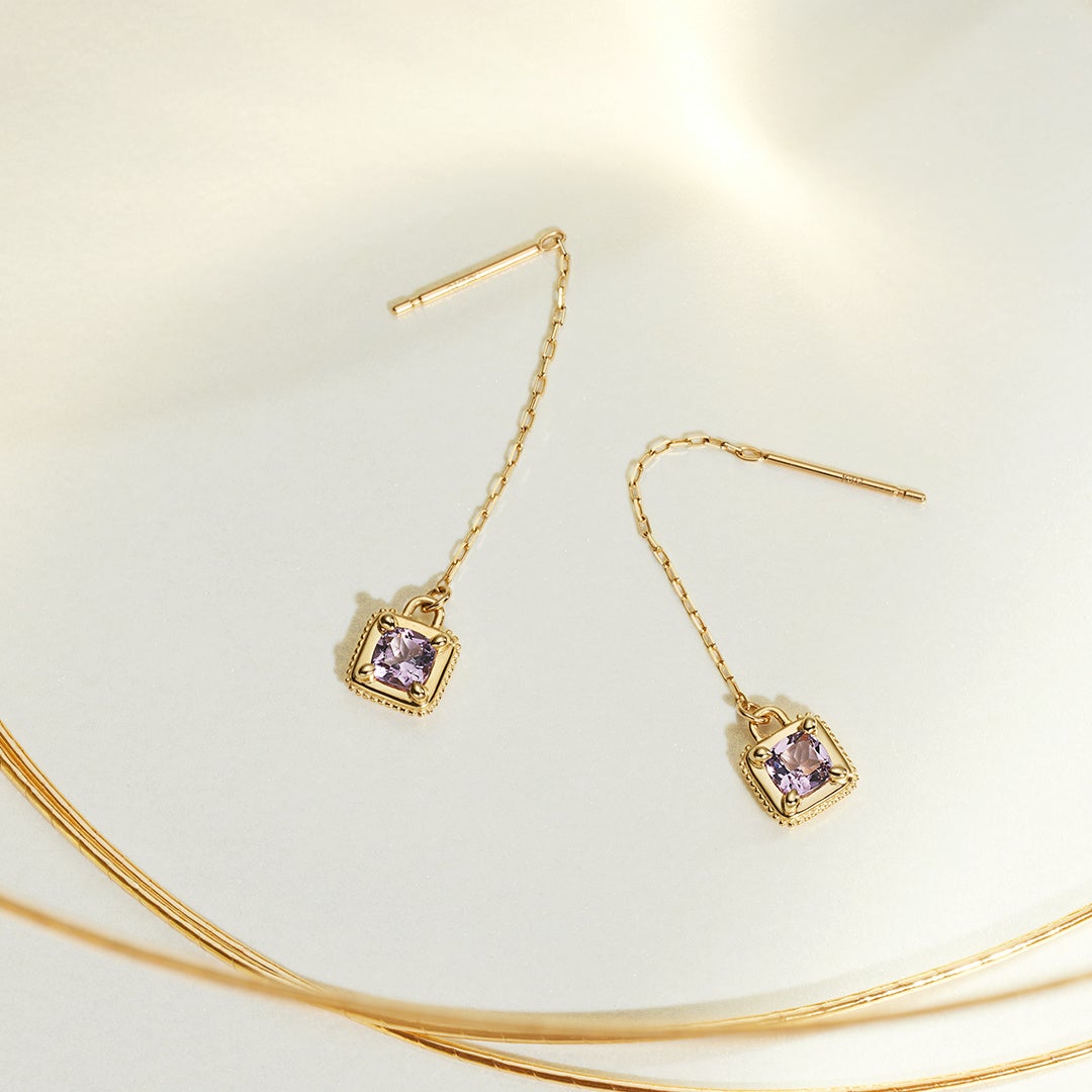 ふんわりとした四角形のクッションカットを施したアメシストは、シャープな印象の中にも柔らかな雰囲気を醸すユニークな印象に。イエローゴールドの地金で包み込み、幸運を運ぶラッキーバッグをイメージしたネックレスは、1本で大人の可愛らしさを彩ります。八角形の光穴からアメシストが覗くチェーンピアスは、動きに合わせてラッキーバッグが揺れるデザイン。風水では全ての方角から幸せを引き寄せて邪気を払うとされる八角形で、縁起のよい末広がりの「8」に囲まれたアメシストが、毎日に小さな幸運をもたらし、心華やぐときめきを与えてくれるはず。