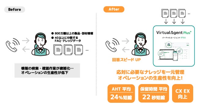 本事例では、VA+を2024年1月の正式リリース前に先行導入しており、月平均3,500件入電する窓口においてトライアル運用を2か月実施。AHT(1応対にかかる平均処理時間)を平均24%短縮、電話応対中の保留時間を平均22秒短縮するなどの効果が出ており、CX(顧客体験価値)向上に寄与しております。