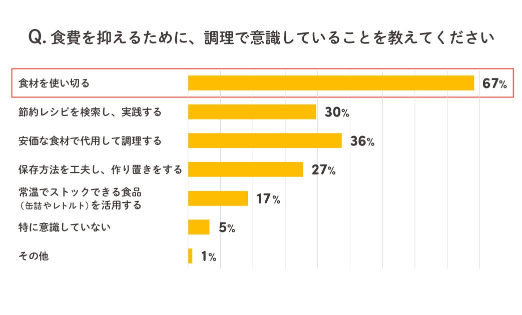回答者の67%が「食材を使い切る」と回答しました。使い切りの工夫として、食材丸ごと使用や大量消費レシピなどを公開し、これフードロス削減にも繋がりますのでご活用ください。