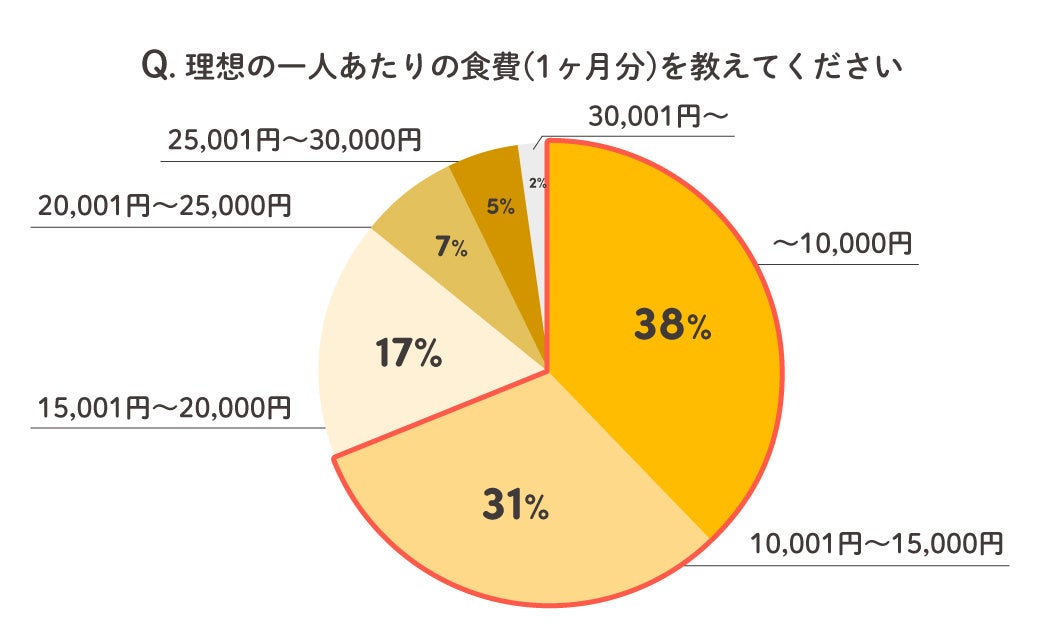 - 現在の一人あたりの食費/月は、「10,001円〜20,000円」が半数を占める