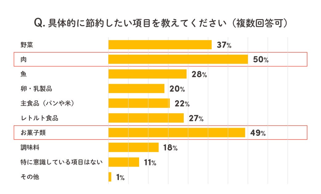 - 回答者の半数が節約したい項目として「肉」を挙げる