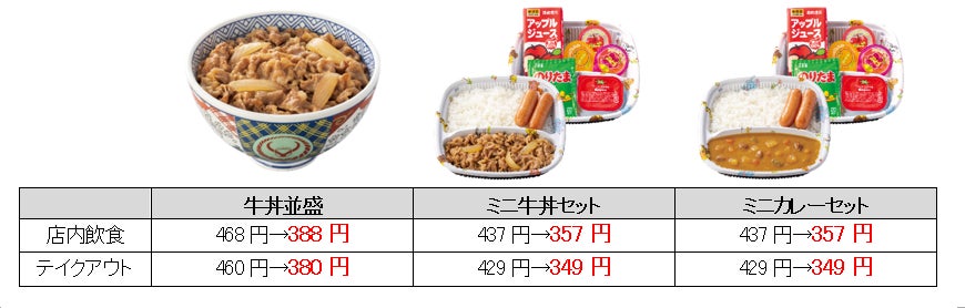店内飲食の場合、「牛丼」並盛は通常税込価格が468円のところ税込価格388円の特別価格で、テイクアウトの場合はテイクアウト特別価格380円(通常税込価格は460円)でお子様の人数分を提供します。テイクアウト利用時はお子様の来店、同伴の必要はありません。お子様の人数を会計時にお伝えください。