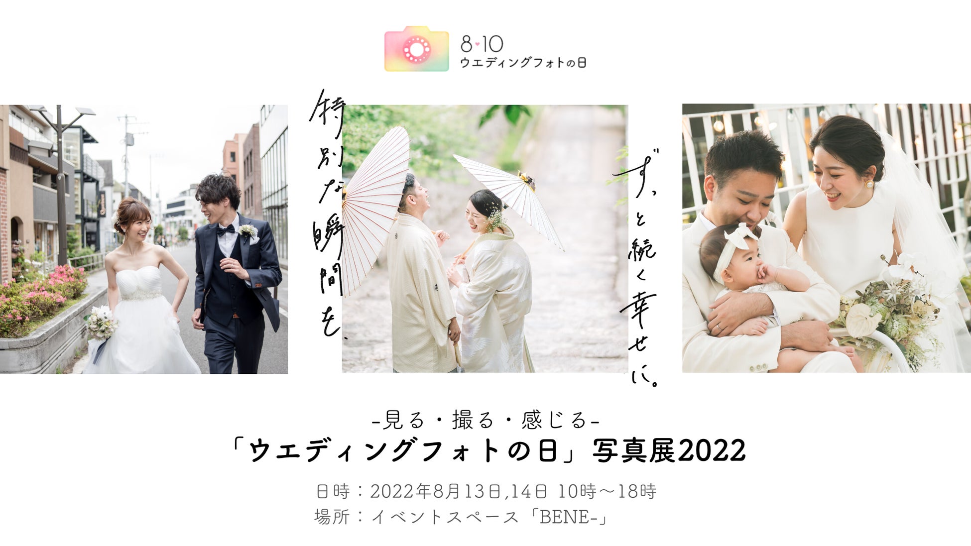 株式会社ウエディングパーク(本社:東京都港区、代表取締役社長:日紫喜 誠吾)が運営するフォトウエディング・前撮りのクチコミ情報サイト「Photorait(フォトレイト)」は、8月13日(土)、14日(日)に「ウエディングフォトの日」制定を記念した特別イベント「- 見る・撮る・感じる -『ウエディングフォトの日』写真展 2022」の開催を決定。本日より受付予約を開始いたしました。