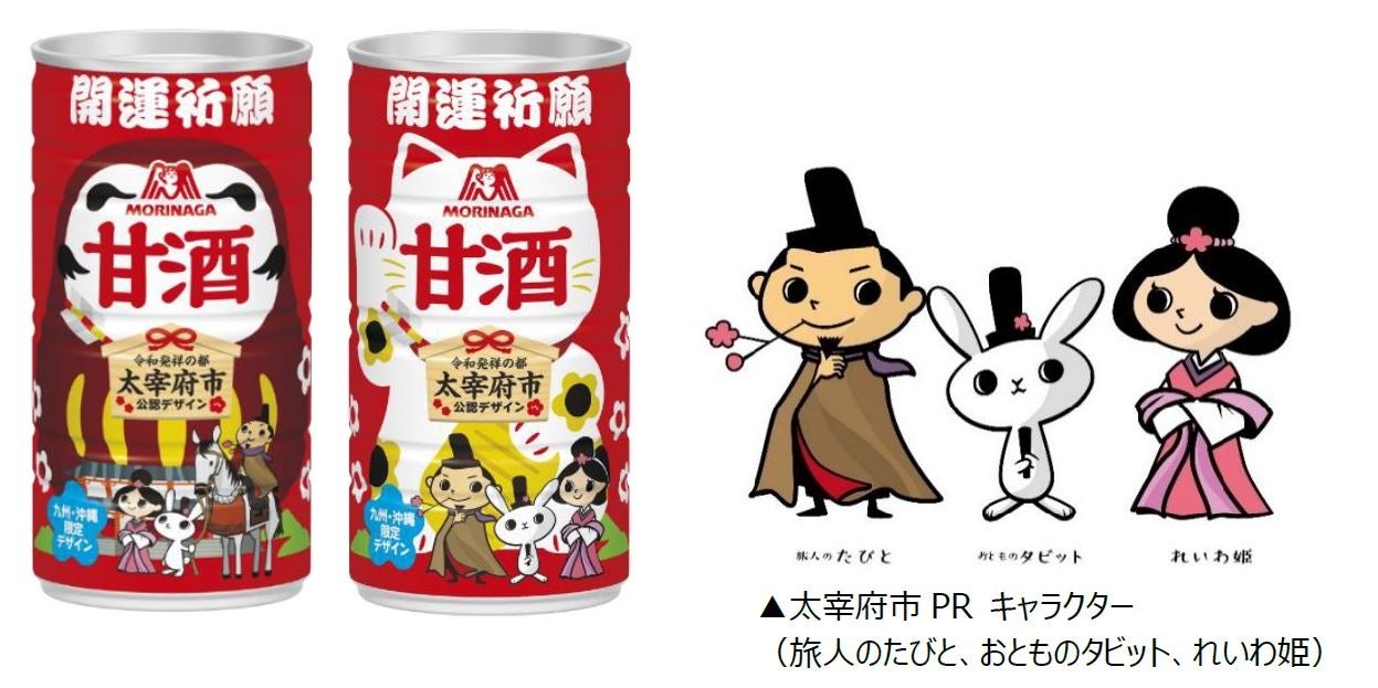赤い缶でおなじみの「森永甘酒」は、赤い柄に梅の花をあしらったデザインが特徴です。梅の花は太宰府の市の花としても親しまれており、「森永甘酒」と太宰府市が梅の花をシンボルとして親和性が高いことからコラボレーションし、今年は3回目となります。太宰府市の「PRキャラクター(旅人のたびと、れいわ姫、おとものタビット)」をあしらった太宰府市公認のデザインです。