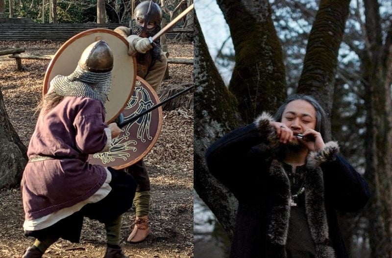 ヴァイキングが使っていた民族楽器「口琴」のソロ演奏と、ヴァイキングの戦いのデモンストレーションを披露。バトルの最後は、北欧神話の戦いの神「オーディン」へ、雄たけびをささげます。