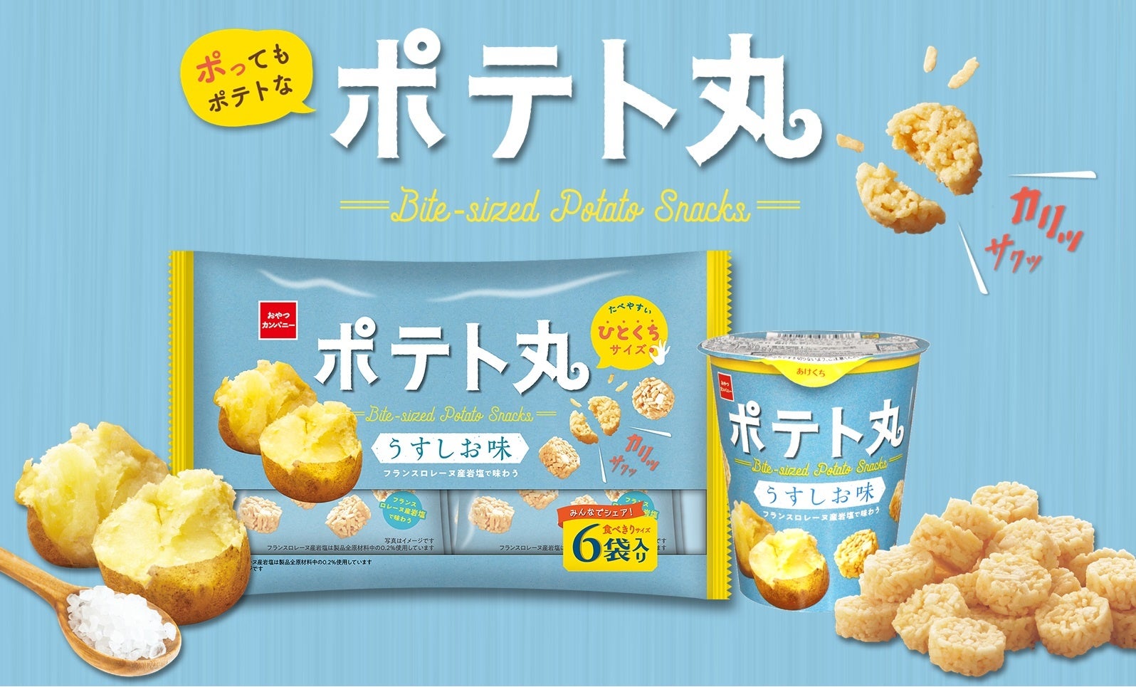 お子様でも食べやすいひとくちサイズのポテトスナック菓子『ポテト丸』は、そんなリモート生活でのON・OFFの切り替えが難しい大人たちのリフレッシュタイムにもぴったり。ポテトを使った生地を細かくカットし、ぎゅ~っとひとくちサイズにまとめた『ポテト丸』は、口に入れた瞬間のカリッサクッとした軽快な食感と、口の中で生地がホロホロッとほどける独特の食感変化を楽しめ、お口にポイッとすれば、ひとくちで心地よい食感とポテトの風味も楽しめる、ちょっと小粋なポテトスナック菓子に仕上がっています。