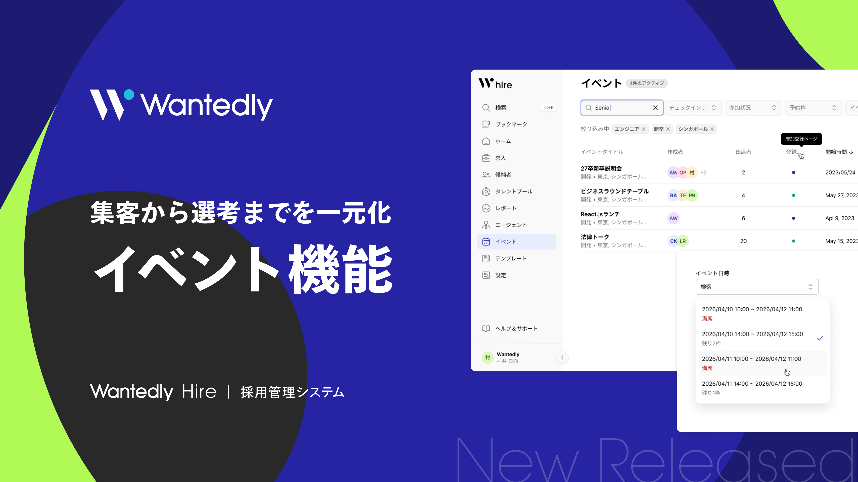 ウォンテッドリー株式会社(本社:東京都渋谷区、代表取締役CEO:仲暁子)は、当社が提供する次世代型採用管理システム「Wantedly Hire(ウォンテッドリー ハイアー)」において、採用イベントの管理ができる「イベント機能」の提供を開始します。