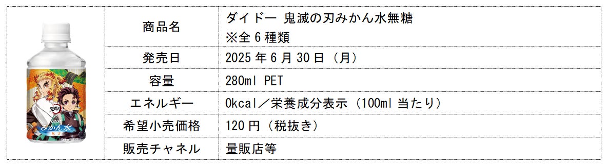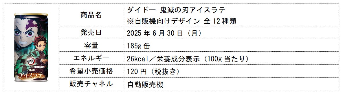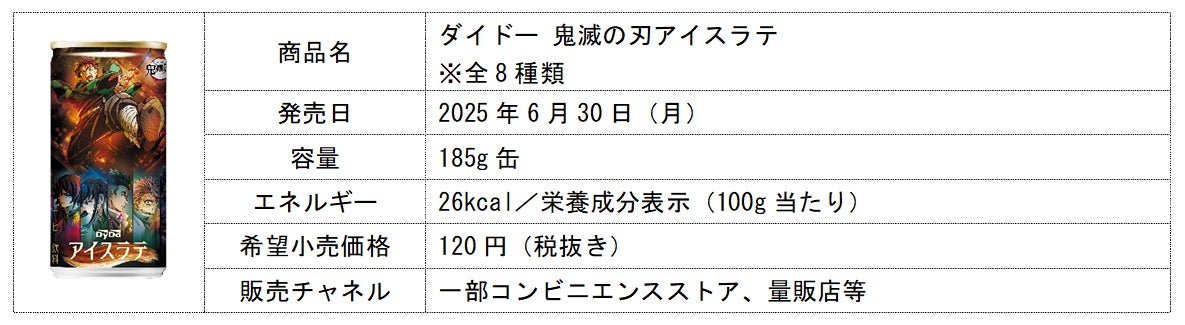 当社は、2025年春夏の新商品として、エスプレッソ仕立てで引き立たせたコーヒーのコクと、北海道産生クリームを使用した豊かなミルクのコクを楽しめる「ダイドー 鬼滅の刃アイスラテ」と、果実らしい甘いみかんの印象がほんのり香る味わいの「ダイドー 鬼滅の刃みかん水無糖」を6月30日(月)から販売しています。デザインは全32種類、商品を集める楽しさとともに、夏の暑い時期にごくごくお飲みいただけるすっきりとした味わいで、大変ご好評をいただいております。