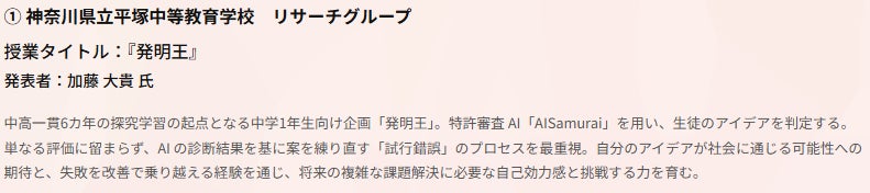 本授業では、特許審査シミュレーションシステム「AI Samurai」を活用し、生徒のアイデアを判定・分析しながら、試行錯誤を繰り返すプロセスを重視しています。AIによる評価結果をもとに改善を重ねることで、生徒が自らのアイデアの可能性を認識し、失敗を乗り越えながら挑戦する経験を積む点が評価されました。