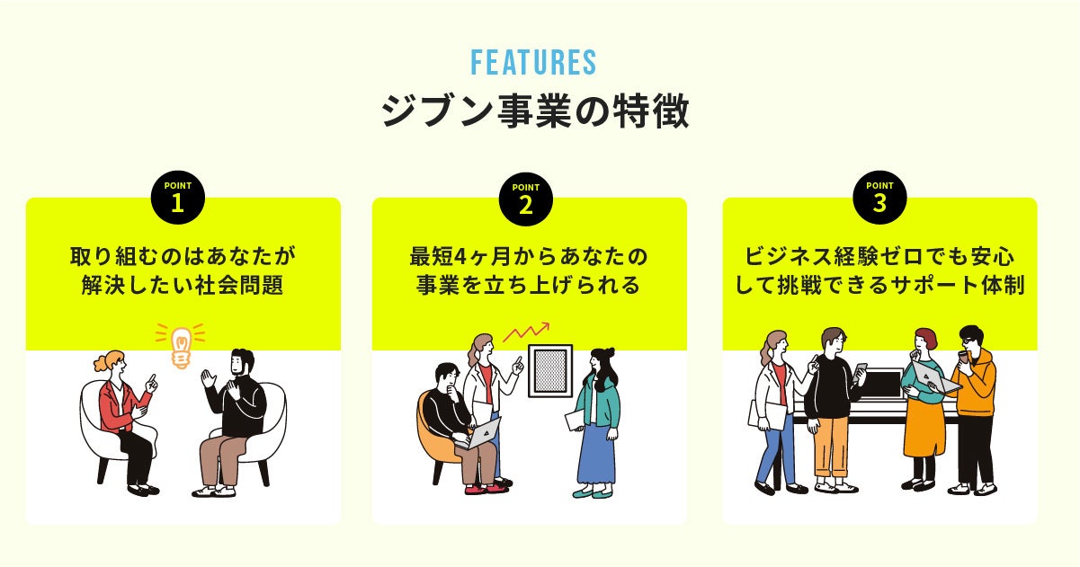 など、最短の事業立ち上げを可能にするジブン事業独自のプランニングサポート体制があります。